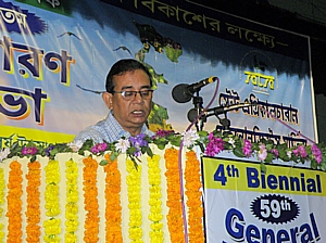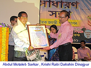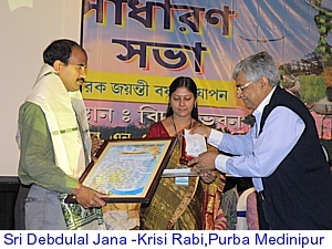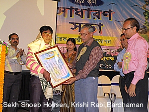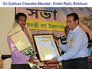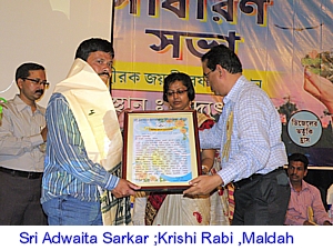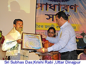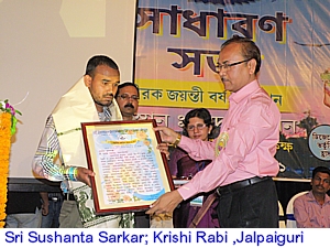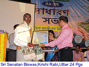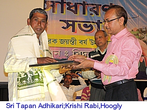 Shri Kamal Bhowmick ,Central Treasurer ,SATSA,WB submitted the detail audited accounts for the year 2011 & 2012. He presented the proposed budget for the year 2013 & 2014. He conluded with a hope to enhance financial strength of the association in future. Shri Goshto Nayban , Joint Secretary (Press & Publicity),SATSA,WB stated that a separate account for SATSA publication has been opened as per recommendation of the 3rd BGM. The association has already published ten booklets on different subjects related to agriculture and the 11th Krihi Pustika on potato cultivation would be published on that day along with the Annual Technical Issue,Volume : 17 titled Seed:Hope To Harvest. He communicated that there has been a constant endeavour to make the SATSA website informative and up to date. Shri Nayban submitted the audited accounts of SATSA Publication for 2011 &2012 and placed the proposed budget for 2013 & 2014. He solicited active cooperation from members. On arrival of Shri Pradip Kumar Mazumdar, Ag.Advisor to the Hon’ble Chief Minister, he was greeted by the General Secretary. Shri Pradip Mazumdar in his brief speech thanked SATSA for inviting him to the BGM. He acknowledged the cooperation of the agricultural technologists he has been receiving, both from inside and outside the state. He expressed concern about the poor infrastructure of the department at the block level, but assured the house that steps are being taken by the Hon’ble Chief Minister for improving the situation. He stressed on the need for acknowledging the contribution of the farmers for the society in form of rewards. He proposed restructuring of farming system with an aim to help the farmers. He communicated that the government is emphasizing on cultivation of scented rice, pulse and oilseeds which might be more remunerative for the farmers. Shri Mazumder advocated in favour of market oriented farming system for better economic returns to the farming community. Construction of sixty three markets with cold storage, advisory service etc. at block level has already been taken up for assuring direct access of farmers to the buyers within 2014. This facility will be extended to each and every block of the state in due course. According to him smiling face of farmers having satisfactory lifestyle should be the ultimate goal of the agricultural technologists. With a few words of praise for the commitment of SATSA towards agricultural development he concluded. Dr. Paritosh Bhattacharya, the Director of Agriculture, Govt. of West Bengal was received with a warm welcome by the General Secretary. Dr.Bhattacharya explained the sea change in the system of work of the department from T&V era to modern concept of ATMA. He expressed satisfaction for being able to improve the quality of inputs distributed by the department and thanked the seed certification and seed testing discipline for their cooperation even under a state of poor manpower and infrastructure. He could not assure appointment on permanent basis for filling up vacant posts due to financial constraints. However effort is on to ease the situation to some extent through engagement on contractual basis. He appealed for cooperation from all to deliver better service to the farmers under adverse situation. In tune with what Shri Mazumdar said , a session was conducted to felicitate selected farmers, one from each of the eighteen districts excluding Kolkata, who deserved special mention for their performance and contribution in the field of agriculture and allied sectors, as “Krishi Rabi-2013”.The house was impressed by the brief audio visual presentation on the works of each of the selected Krishi Rabi-s. The Krishi Rabi-s were felicitated by Shri Pradip Mazumdar, Dr.Paritosh Bhattacharya, General Secretary, President and the three VicePresidents. The Krishi Rabi-s for 2013 were Shri Mahadeb Mandal(Bnakura), Janab Sekh Soeb Hossen (Bardhaman), Shri Subhas Chandra Mandal (Birbhum), Shri Ramen Barman(Cochbehar), Shri Tapan Sardar (Dakshin 24 Pargana), Janab Abdul Motaleb Sarkar (Dakshin Dinajpur), Shri Jogendra Kharka(Darjeeling), Shri Tapan Adhikari (Hoogly), Shri Sristidhar Jana (Howrah), Shri Sushanta Sarkar(Jalpaiguri), Shri Adwaita Sarkar (Maldah), Shri Amulyaratan Sahana (Murshidabad), Shrimati Krishna Ballav(Nadia), Shri Jayanta Kumar Sau(Paschim Medinipur), Shri Debdulal Jana (Purba Medinipur), Shri Birendra Nath Mahato(Purulia), Shri Sanatan Biswas(Uttar 24 Pargana), Shri Subhas Das (Uttar Dinajpur). POST LUNCH SESSION The members were invited for discussion on the report of the General Secretary, Budget and pertinent issues. Shri Birendra Nath Mahato , Krishi Rabi of Purulia; on being requested by the President shared his experience with the house. He inspired all by his scientific but down to earth suggestions for exploring different avenues of income for economic upliftment of the farmers. He emphasised on agrosilviculture and discussed the process of raising teak(Segun) seedlings on a commercial basis. He affirmed that without agriculture no other sector, may it be industry or service, could flourish because farming supplies the most basic need of life-FOOD. With sincere note of gratitude for the recognition received from SATSA ,both at the district and the state level , Shri Mahato concluded his speech. Shri Murari Yadab; placed the official resolution, which engulfed the expectations and suggestions of the members, for approval of the house. The salient features of the resolution were- 1 A. Reorientation of Administrative wing under the Directorate of Agriculture. B. Reorientation of Research Wing under the Directorate of Agriculture. 2. Redistribution of Sanctioned Posts in Un-revised Pay Scale Nos.16,17,18 &19 i.e. Pay Band-4,4A,4B and 5 having Grade Pay of Rs.5400/-, 6600/-, 7600/- and 8700/- respectively(ROPA 2009). 3. Creation of Discipline wise separate Directorate under the Department of Agriculture. 4. Change of Recruitment Rules for appointment 