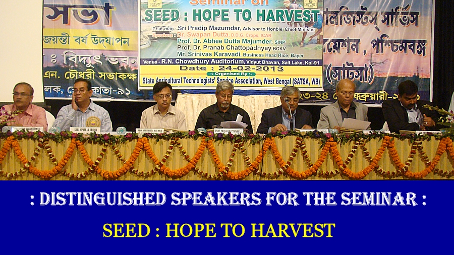 Date : 24.02.2013 SEMINAR - SEED : HOPE TO HARVEST Chairman : Shri Pradip Kumar Mazumdar , Ag. Advisor to the Hon’ble Chief Minister of West Bengal. Speakers : Prof. Swapan Datta ,DDG(crop)ICAR Prof. Abhee Datta Majumdar, High Energy Physics Division, Saha Institute of Nuclear Physics, Kolkata & Working President, West Bengal State Council of Science and Technology Shri Shrinivas Kumar Karavadi, Business Head,Bayer Crop Science (Seed & Trg.),India Prof. Pranab Chatterjee , Retired Professor, Bidhan Chandra Krishi Bishwabidyalay, Mohonpur, Nadia. All the distinguished guests were cordially greeted by SATSA. The program was anchored by Dr. Sukanta Dasgupta. Shri Pradip Majumdar took the chair and congratulated SATSA for chosing an “important and futuristic issue” as the topic of the seminar “quite befitting the occasion of Diamond Jubilee celebration by SATSA, WB”. He introduced the speakers to the audience. Prof Swapan Datta stressed on the need for development of quality seeds at affordable price to ensure food security. He also emphasised on retaining the produce by adopting modern post harvest management technologies. He explained the possibilities of enhancing productivity of pulses, maize and jute seeds. Fodder cultivation, he said, should get due priority. He communicated that the horizon of modern day agricultural research aims to combat climate change, pests, incorporating nitrogen fixation capabilities in cereals etc. He affirmed that science should be used for human welfare. Prof Abhee Datta Majumdar, expressed his view regarding what should be the direction of modern day research. He cautioned about the privatisation of the research system and the world as well. He questioned whether the logic of profit should be accepted as the driving force for developmental planning. According to him the policies of developing countries are often guided by requirement of the core countries. He pointed to the dangers of unipolar world. Mentioning about the loss we had to incur due to petrochemical based agriculture, promoted in 1965 under the pressure of interest groups, he appealed for a controlled use of science and doing away with the “logic of economic viability” during policy formulation .He agreed that Genetic Engineering is one of the best technologies for the mankind but we have to remain cautious about its misuse. Shri Shrinivas Kumar Karavadi explained the potentiality and benefit of hybrid rice and established sustained yield benefit to a tune of twenty five percent of some varieties under West Bengal condition through presenting yield data of last five years. He also described different ventures of Bayer Crop Science, India in the field of agriculture. Prof. Pranab Chatterjee ,an eminent crop breeder commenced his speech by saying “To achieve food security we need Seed Security”. He expressed his dismay at the poor rate of seed replacement in the State. He suggested for establishing a seed producing hub at the western part of the State. He described a model of Seed Village along with its administrative set up and modalities for running it successfully up to marketing. He referred to the success story of Gnotra SKUS of Nadia following the presented model. He mentioned seed sector as the “Core area for strengthening rural economy”. The Chairman summed up the views of the speakers thanking them for their kind participation. The 4th BGM came to an end with a vote of thanks by Shri Shibabrata Ghatak on behalf of SATSA, West Bengal .
